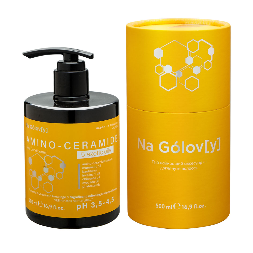 Аміно-церамідний кондиціонер для волосся 5 екзотичних олій ТМ «Na Gólov[y]» забезпечує ефективне кондиціонування та сприяє легкому розчісуванню. Комплекс екзотичних олій і фітостеролів сприяє зволоженню, пом’якшенню та надає еластичності волоссю. Кондиціонер зберігає доглянутий вигляд волосся, забезпечує гладкість і блиск, усуває сплутування.