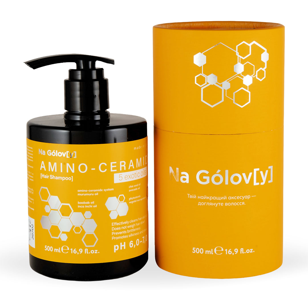 Аміно-церамідний шампунь для волосся 5 екзотичних олій ТМ «Na Gólov[y]» ефективно очищує шкіру голови та волосся, не спричиняючи пересушування. Натуральні зволожувальні компоненти допомагають запобігти ламкості. Комплекс екзотичних олій і мікропротеїнів сприяє зміцненню волосся, надає йому шовковистості та блиску без ефекту обтяження.