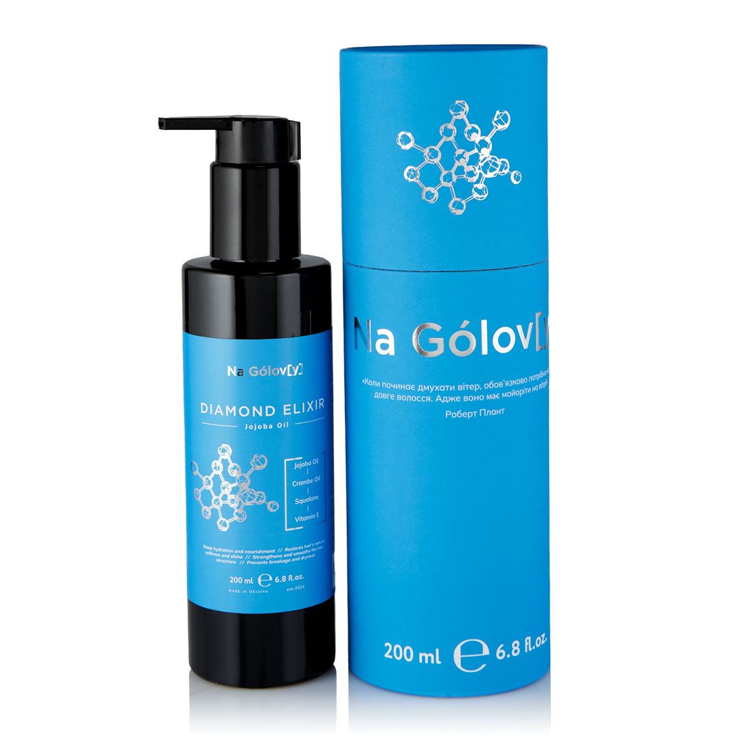 Флюїд для волосся з олією жожоба DIAMOND ELIXIR ТМ «Na Gólov[y]» допомагає зберігати зволоженість і природний блиск волосся. Олія жожоба сприяє живленню та догляду, роблячи волосся шовковистим і м’яким. Олія крамбе додає еластичності та полегшує укладання. Сквалан і вітамін Е допомагають відновити гідроліпідний баланс, сприяючи захисту волосся від пошкоджень і забезпеченню його здорового вигляду.