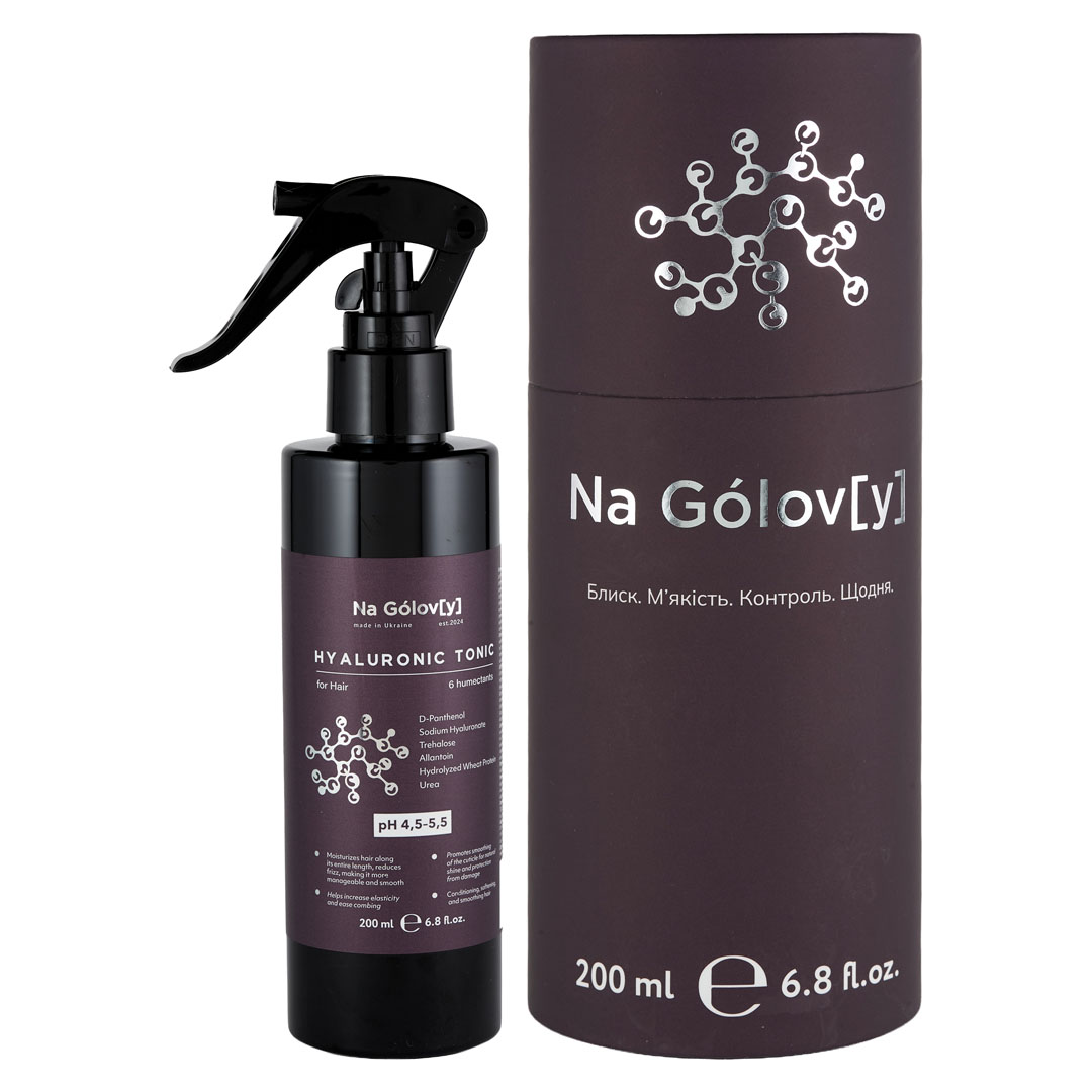 Гіалуроновий тонік для волосся ТМ «Na Gólov[y]» — засіб для зволоження та відновлення волосся. Його унікальна формула з комплексом зволожувачів проникає по всій довжині волосся, наповнюючи його вологою, покращує структуру та надає м’якості, еластичності й природного блиску. Зменшує розпушеність і ламкість, полегшує розчісування, захищає волосся від негативного впливу зовнішнього середовища. Підходить для щоденного використання та для всіх типів волосся, залишаючи відчуття свіжості й доглянутості без обтяження.