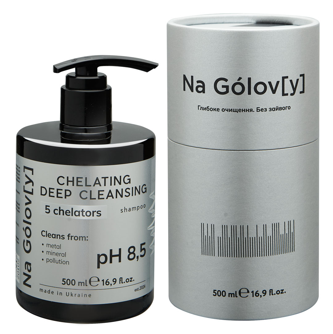 Хелатувальний шампунь глибокого очищення ТМ «Na Gólov[y]» створений для очищення шкіри голови та волосся від накопичень, забруднювачів, себуму, іонів металів і солей жорсткості. Містить комплекс із 5 хелаторів, які ефективно зв’язують метали, що містяться у водопровідній воді та допомагають видалити накопичення з волосся. Завдяки слаболужному рН хелатувальний шампунь піднімає лусочки кутикули та сприяє більш ефективному очищенню.