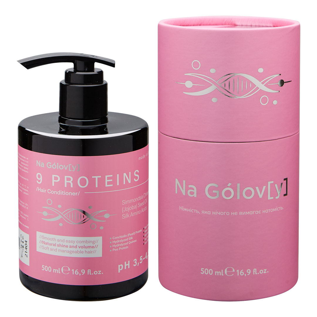 Кондиціонер для волосся 9 протеїнів ТМ «Na Gólov[y]» призначений для відновлення здорового вигляду пошкодженого волосся, яке втратило природний блиск і м’якість. Кремова текстура засобу огортає кожне пасмо та візуально ущільнює його, надаючи об’єму, а комплекс із 9 протеїнів забезпечує життєву силу та пружність. Поєднання олії жожоба й амінокислот шовку сприяє живленню, наданню природного блиску, гладкості та шовковистості вже після першого застосування.