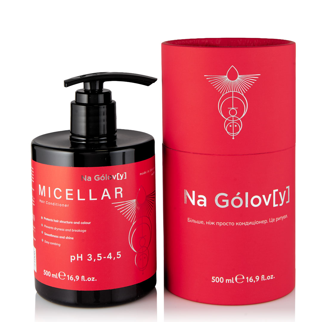 Міцелярний кондиціонер для волосся ТМ «Na Gólov[y]» допомагає зберегти природний ліпідний бар’єр і зволожити волосся без ефекту жирності та обтяження. Комплекс фосфоліпідів та олії соняшника завдяки спорідненій до волосся природі сприяє відновленню його структури і захисту кольору, надає еластичності та об’єму. Кондиціонер підтримує здоровий вигляд волосся, надає гладкості та блиску.