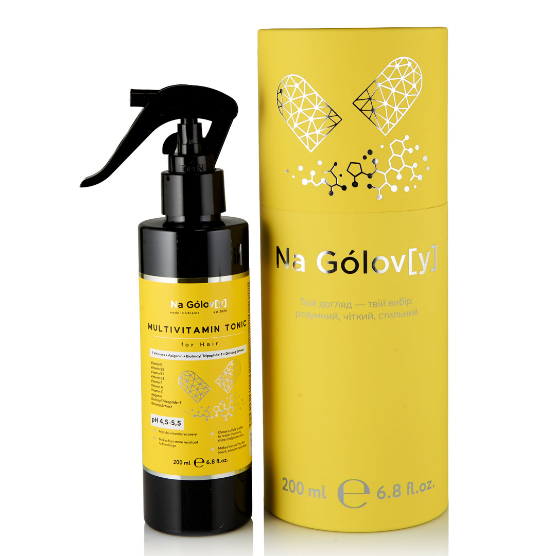 Мультивітамінний тонік для волосся ТМ «Na Gólov[y]» збагачений вітамінами, антиоксидантами та пептидами, які зміцнюють волосся на всій довжині. Зволожує волосся, підвищує еластичність і стійкість до ламкості, має термозахисні властивості. Волосся стає гладким, менше сплутується, легко розчісується та краще утримує вологу. Тонік покращує стан волосся, надаючи йому блиску, м’якості та доглянутого вигляду.