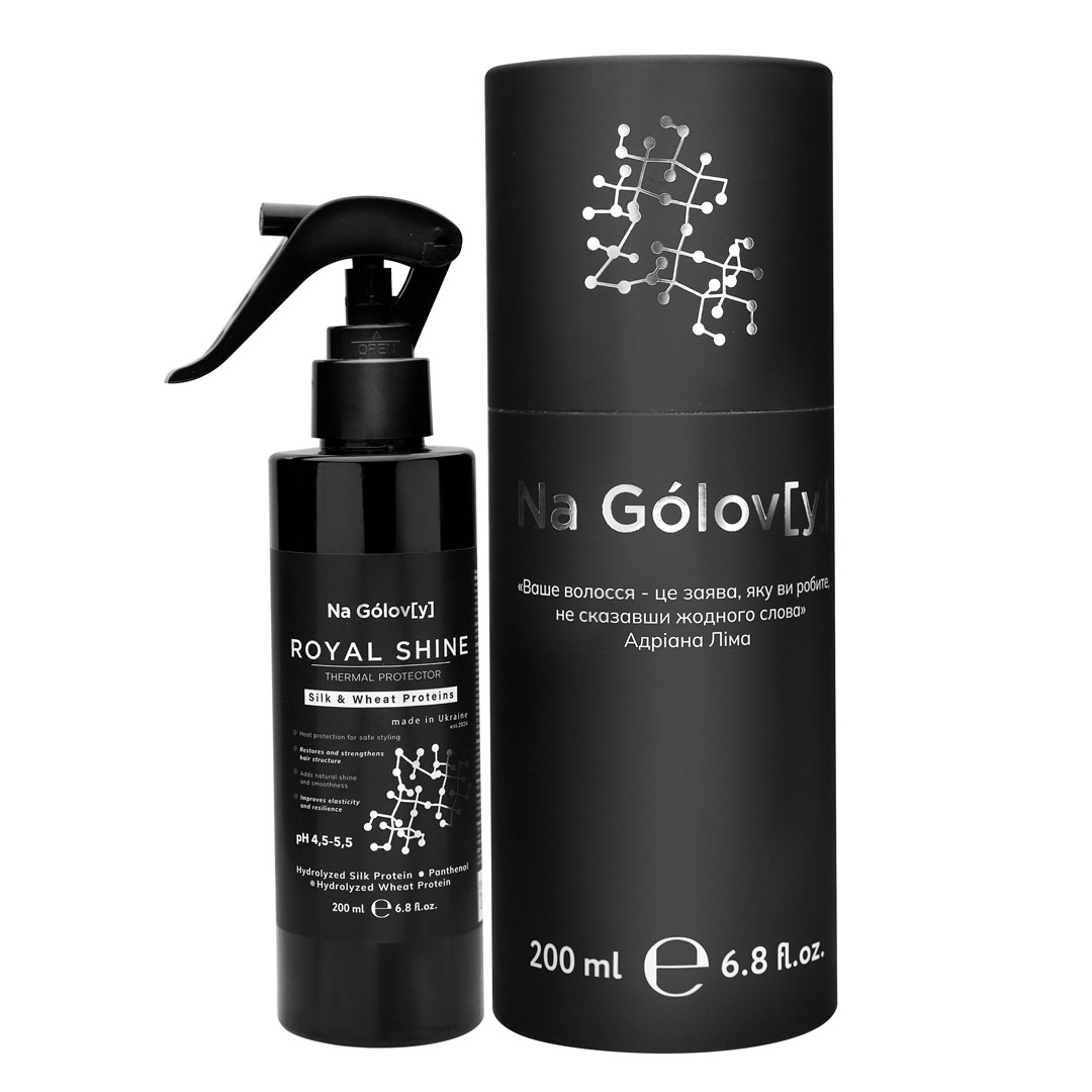 Спрей-термозахист із гідролізованим шовком ROYAL SHINE ТМ «Na Gólov[y]» містить комплекс активних компонентів, які допомагають захистити волосся від високих температур під час укладання. Гідролізований шовк і протеїни пшениці допомагають підтримувати структуру волосся, зберігаючи його гладкість, природний блиск та еластичність. Пантенол сприяє глибокому зволоженню, полегшенню укладання і допомагає підтримувати доглянутий вигляд.
