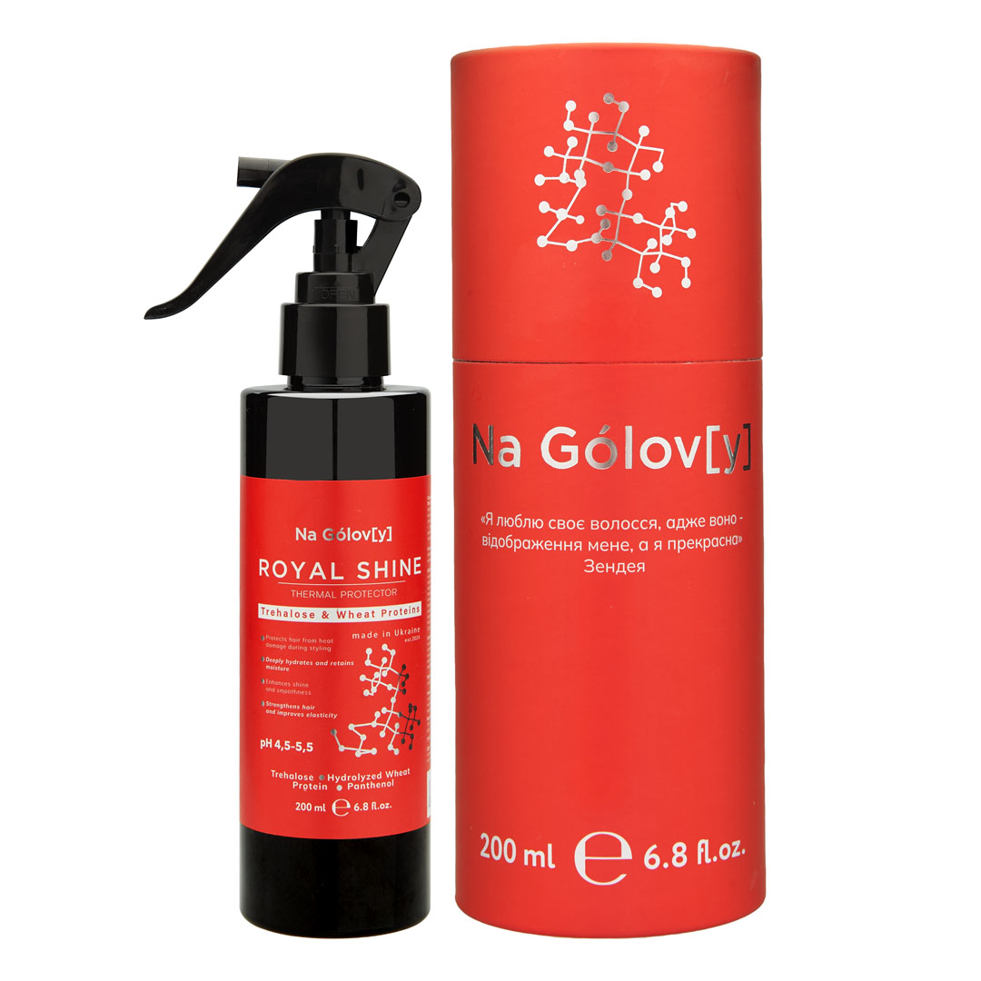 Спрей-термозахист із трегалозою ROYAL SHINE ТМ «Na Gólov[y]» розроблений для захисту волосся від термічних пошкоджень. Трегалоза та гідролізовані протеїни пшениці сприяють інтенсивному зволоженню та допомагають утримувати вологу у волоссі, підтримуючи його міцність і гладкість. Пантенол у складі забезпечує глибоке зволоження волосся, сприяє полегшенню укладання та допомагає підтримувати доглянутий вигляд.