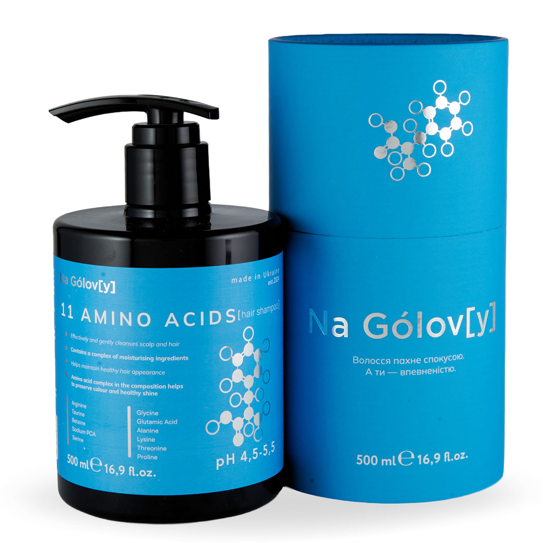 Шампунь для волосся 11 амінокислот ТМ «Na Gólov[y]» ефективно й лагідно очищує шкіру голови та волосся, не пересушуючи його. Збалансована формула шампуню містить комплекс зволожувальних компонентів, які допомагають підтримувати здоровий вигляд волосся. Синергетична комбінація амінокислот сприяє міцності, гладкості та блиску волосся, а також збереженню кольору.