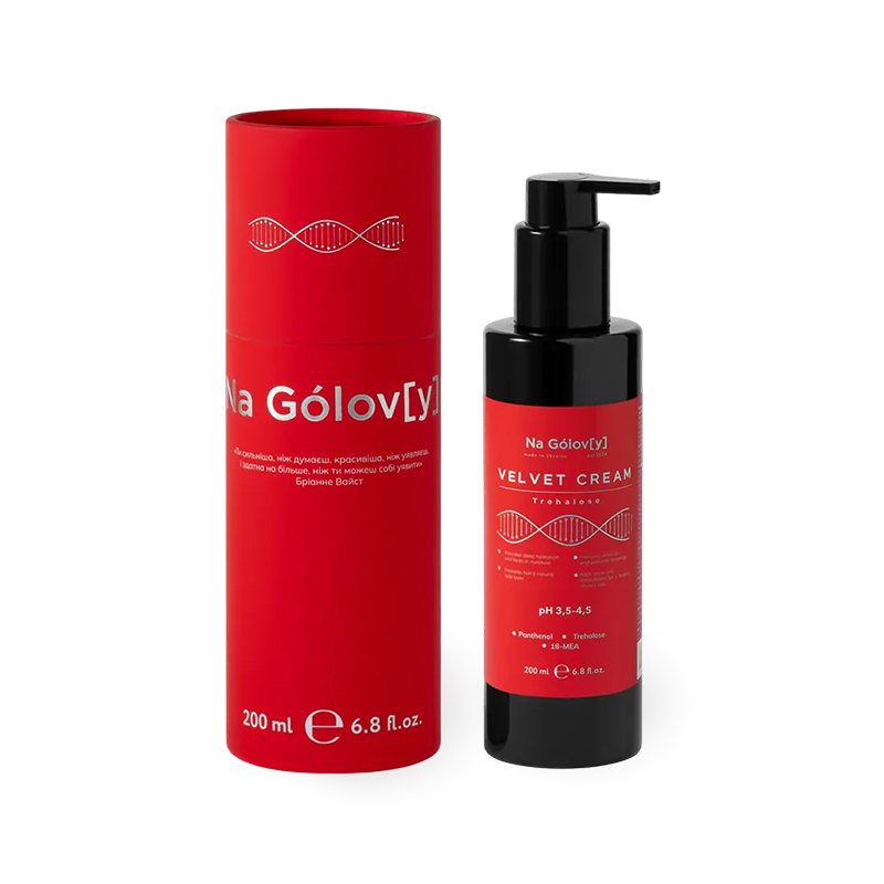 Незмивний крем-кондиціонер із трегалозою VELVET CREAM ТМ «Na Gólov[y]» створений для інтенсивного зволоження волосся. Завдяки трегалозі засіб сприяє утриманню вологи в структурі волосся та допомагає захищати його від пересихання. Комплекс 18-MEA допомагає підтримувати природний ліпідний шар волосся, підвищуючи його еластичність і захист від пошкоджень. Пантенол пом’якшує і зміцнює волосся, залишаючи його здоровим і доглянутим на вигляд.